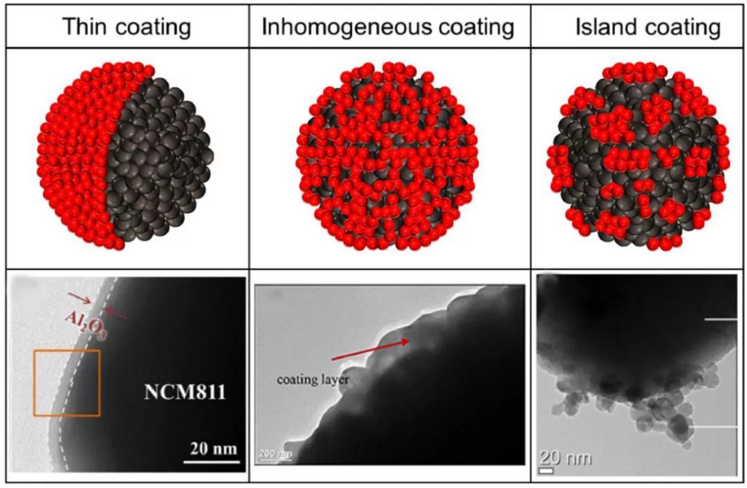 包覆層應均勻且薄。正極顆粒的完全覆蓋將保護正極免受電解質侵襲,抑制副反應。此外,薄包覆層能提高界面處的動力學,改善電池性能。