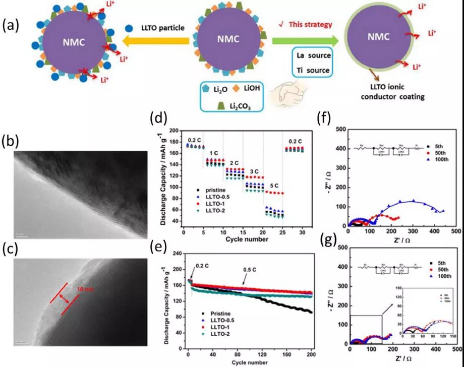 圖7、LLTO改性的LiNi0.6Co0.2Mn0.2O2示意圖及其電化學性能