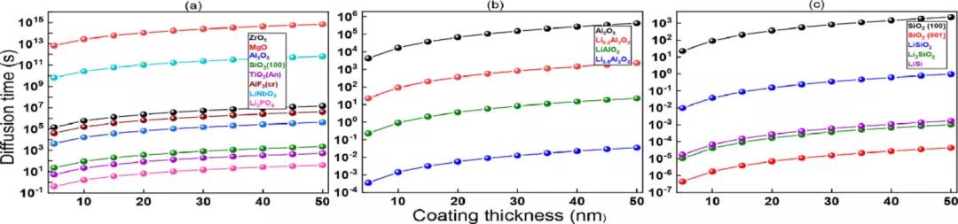 某些表面包覆會阻礙離子擴散,但提供其他優(yōu)勢,而某些包覆可以增強離子擴散,但損害其他性能。在采用包覆時,折衷考慮這些影響一直是電池研究的重點。包覆厚度與包覆層的鋰離子擴散率之間的結構特性相關性是衡量折衷標準的一個有效方法。圖10提供了擴散時間與包覆厚度的關系。大多數(shù)氧化物和氟化物的鋰離子擴散率極低。對于較厚的包覆,擴散時間更長。這些表面包覆厚度應小于10nm,以獲得更好的電化學性能。