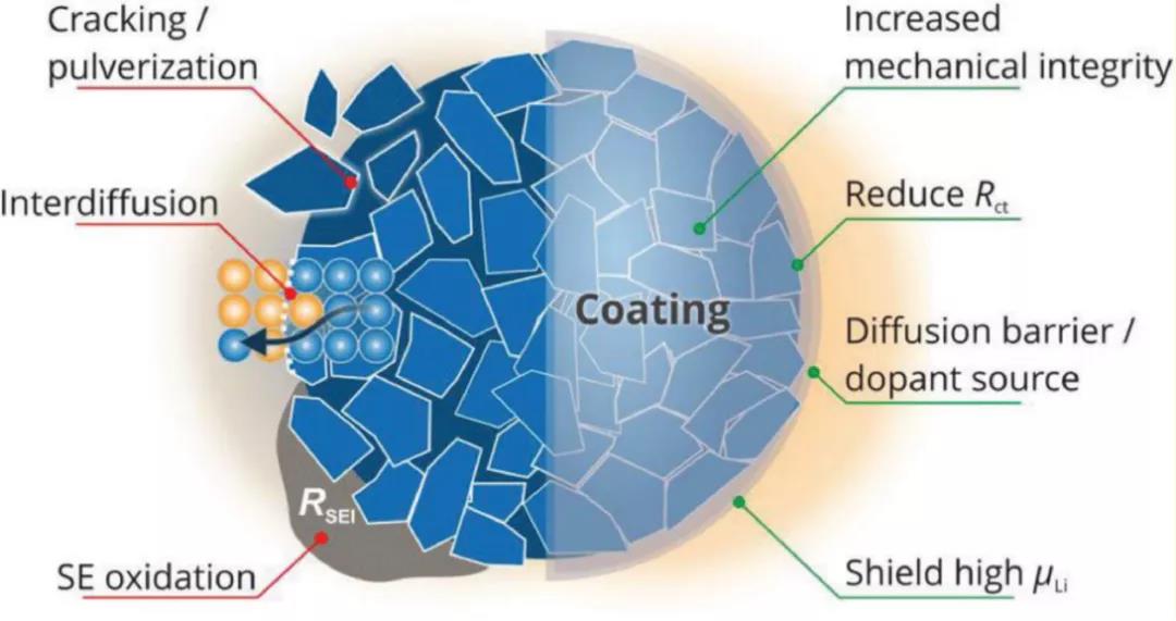全固態(tài)電池由于高的安全性被認為是電池研發(fā)的重點。但是,固體電解質(SE)與正極材料直接接觸時存在不穩(wěn)定問題。當與正極材料直接接觸時,SE易氧化,形成電阻性界面并增加電池阻抗,導致容量快速衰減。SSB中也需要正極材料表面包覆,抑制這些氧化反應。因此,SSB正極材料需要電絕緣和離子導電的表面包覆層。