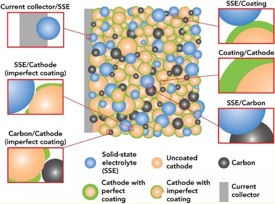 包覆層應均勻且完全覆蓋正極顆粒,并保證正極顆粒之間的接觸以提供導電網(wǎng)絡。硬而脆的包覆層在電極制造過程中易形成裂紋,因此形成顆粒接觸,但可能導致SE分解。如果包覆層是塑性且可變形,則它可以通過變形而形成新的接觸點而不會形成裂紋。表面包覆應抑制或適應正極材料的體積變化,以保持顆粒間的接觸。另外,正極活性材料和SE之間也可能相互擴散。包覆會抑制這種相互擴散,減輕電阻性界面的形成。